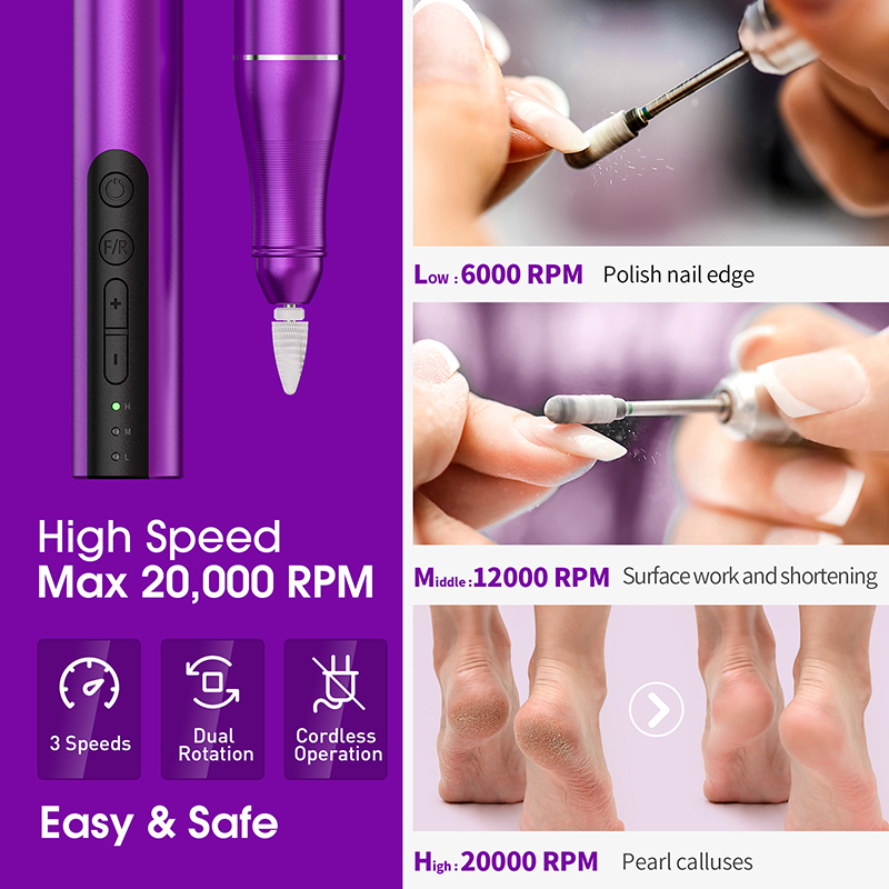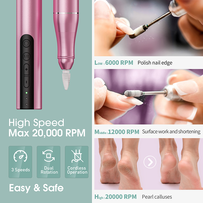 ตะไบเล็บมืออาชีพได้รับการออกแบบด้วยความเร็ว 3 ระดับ 6000-12000-20000 เพียงกดปุ่ม + หรือ - สั้นๆ เพื่อเพิ่มหรือลดความเร็ว ปรับความเร็วได้ง่ายและประหยัดเวลาในการลับเล็บ ทิศทางของสว่านสามารถเปลี่ยนได้อย่างง่ายดายโดยการกดปุ่ม F/R เหมาะสำหรับผู้ถนัดซ้าย ช่างทำเล็บระดับปรมาจารย์ หรือผู้เริ่มหัดดูแลเล็บ