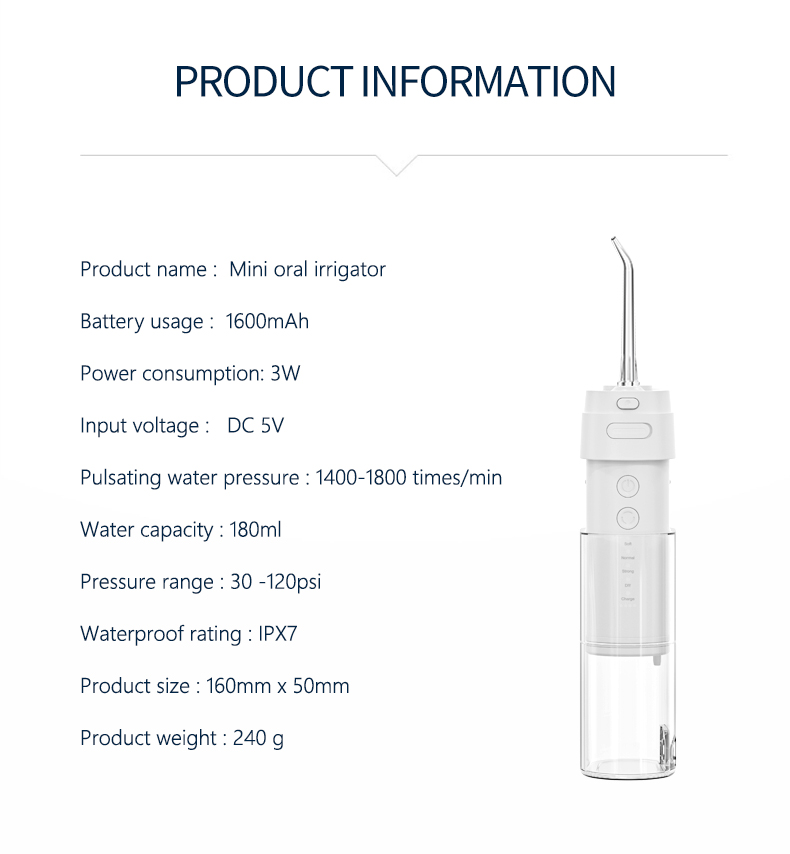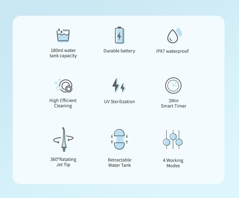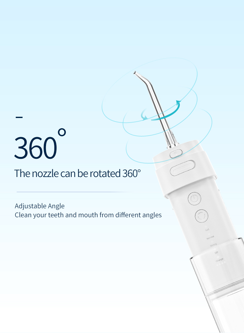 ไม้จิ้มฟันแบบฉีดน้ำแรงดันสูงนี้ส่งพัลส์แรงดันน้ำสูง 1,400-1,800 ครั้งต่อนาที ขจัดคราบพลัคได้อย่างมีประสิทธิภาพ 99.9% เพื่อทำความสะอาดฟันอย่างล้ำลึก ไม้จิ้มฟันแบบฉีดน้ำแรงดันสูงนี้นวดเหงือก กระตุ้นการไหลเวียนโลหิต และแก้ไขปัญหาช่องปาก เช่น กลิ่นปาก ฟันผุ