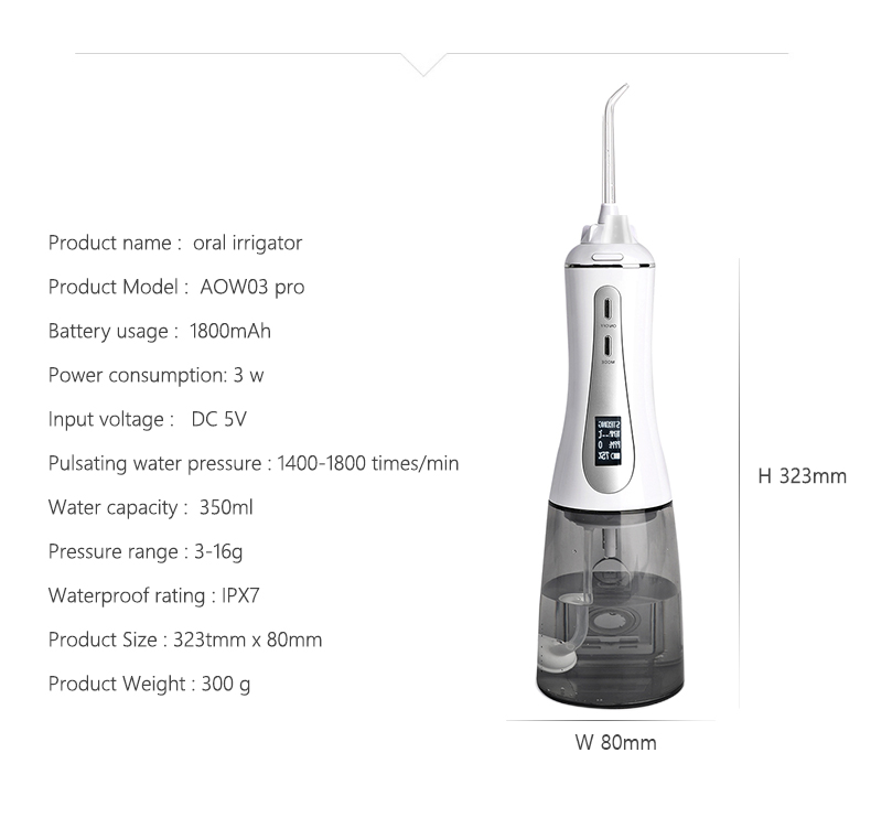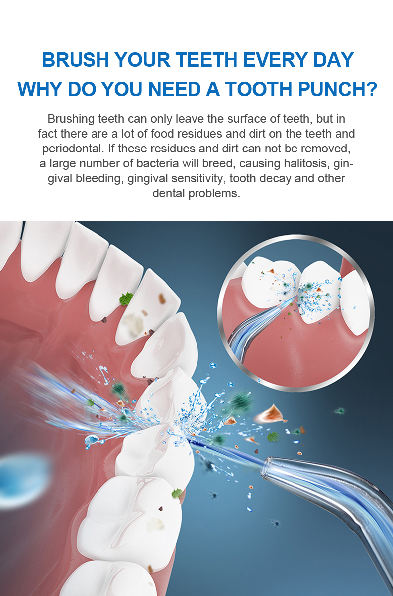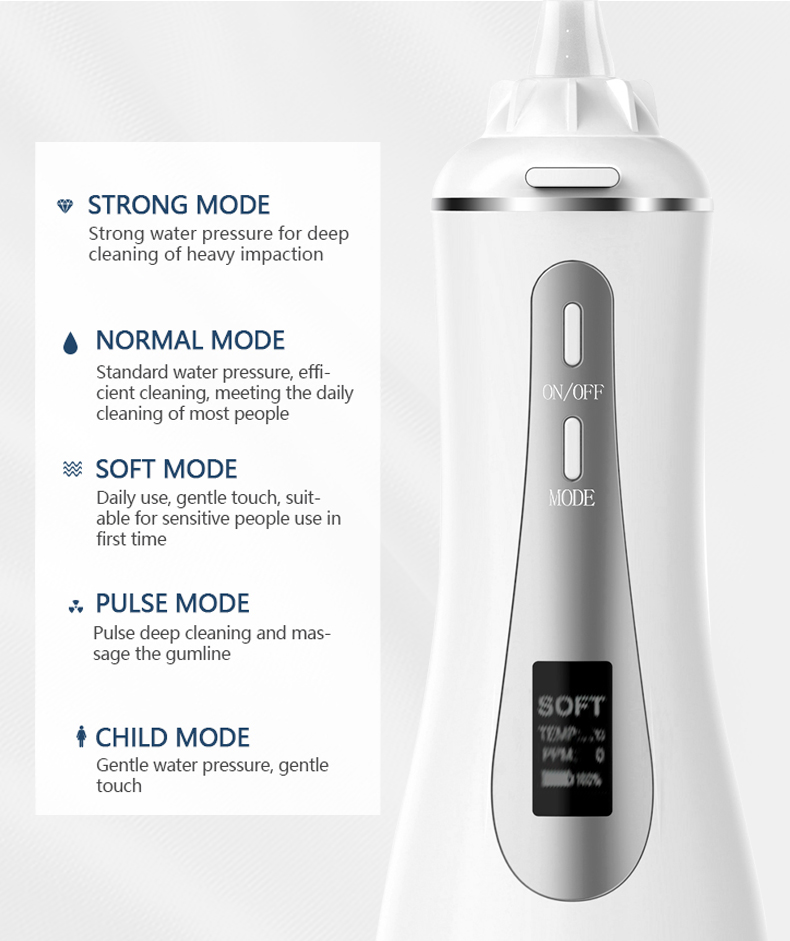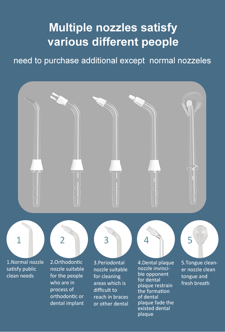ไม้จิ้มฟันแบบน้ำนี้ให้แรงดันน้ำสูงที่ 1400-1800 ครั้งต่อนาที ขจัดคราบจุลินทรีย์ทางทันตกรรมได้อย่างมีประสิทธิภาพ 99.9% เพื่อการทำความสะอาดฟันแบบล้ำลึก ไม้จิ้มฟันแบบน้ำนี้นวดเหงือก ส่งเสริมการไหลเวียนโลหิต และแก้ไขปัญหาในช่องปาก เช่น กลิ่นปาก การจัดฟัน
