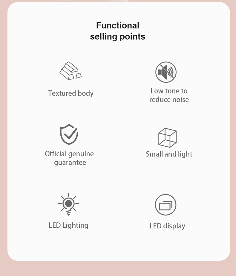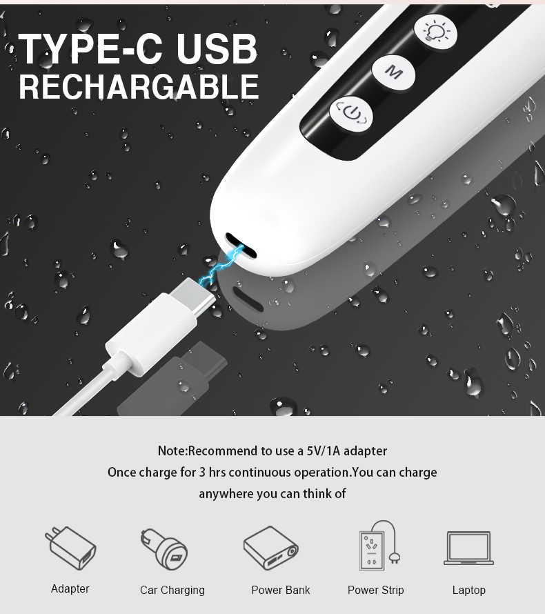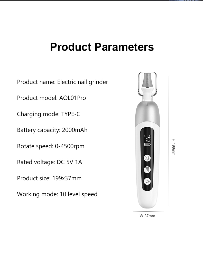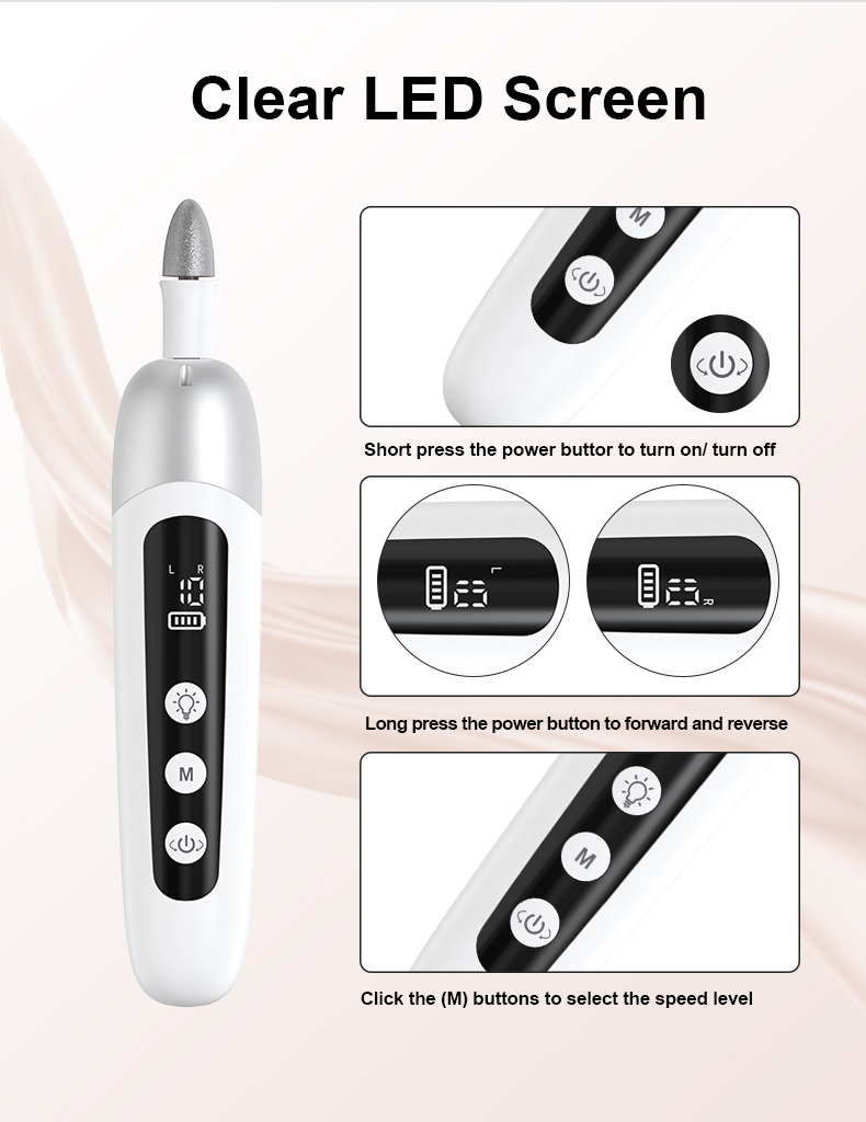 - จอแสดงผล LED ที่ทันสมัย: นำทางการตั้งค่าที่ต้องการได้อย่างราบรื่นและง่ายดาย จอแสดงผล LED แสดงสถานะแบตเตอรี่ ความเร็วที่ต้องการ และการตั้งค่าการหมุนเพื่อการทำงานที่ง่ายดาย เครื่องตะไบเล็บไฟฟ้ายังติดตั้งไฟ LED ในตัวเพื่อส่องสว่างบริเวณมือและเท้า