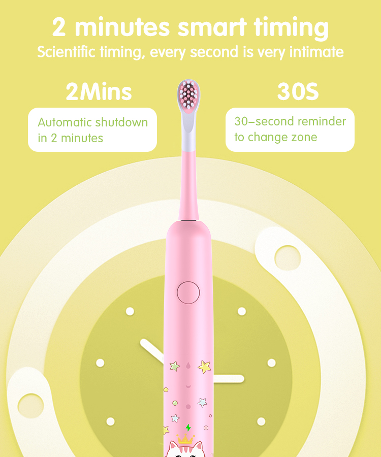 - ตัวตั้งเวลาอัตโนมัติ: แปรงสีฟันไฟฟ้านี้มีตัวตั้งเวลาอัจฉริยะในตัว 2 นาทีที่ช่วยกระตุ้นให้ลูกน้อยของคุณแปรงฟันเป็นเวลานานขึ้น พัฒนาพฤติกรรมการแปรงฟันที่ดี และลดฟันผุ