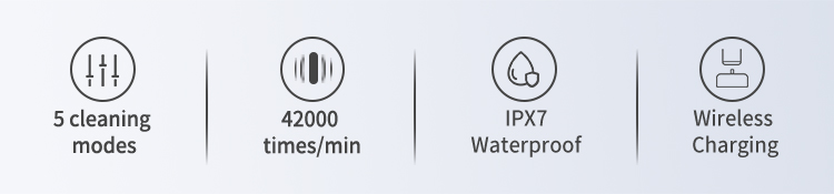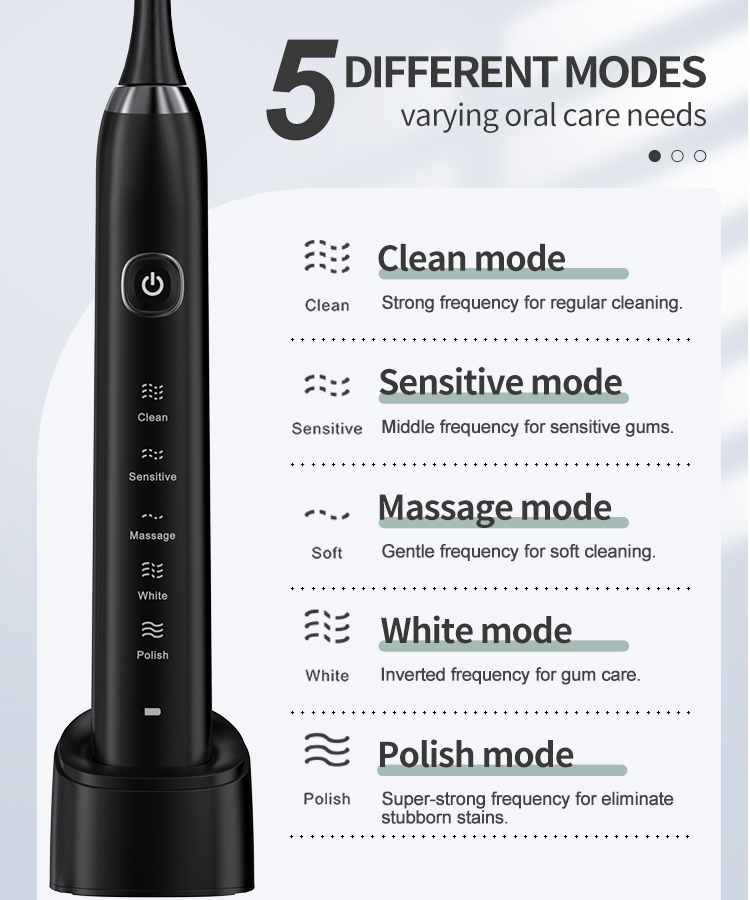 - โหมดการแปรงฟันประสิทธิภาพสูง 5 โหมด ได้แก่ โหมดสะอาด (อ่อนโยน) โหมดขาว (เข้มข้น) โหมดขัดเงา (ความถี่การกลับด้านรุนแรง) โหมดอ่อนกว่า (ความถี่การกลับด้านรุนแรง) และโหมดละเอียดอ่อน (นุ่ม) เพื่อให้เหมาะกับสภาพฟันและเหงือกที่แตกต่างกัน ดังนั้น คุณสามารถเลือกโหมดต่างๆ ได้ตามความต้องการและคำแนะนำของทันตแพทย์