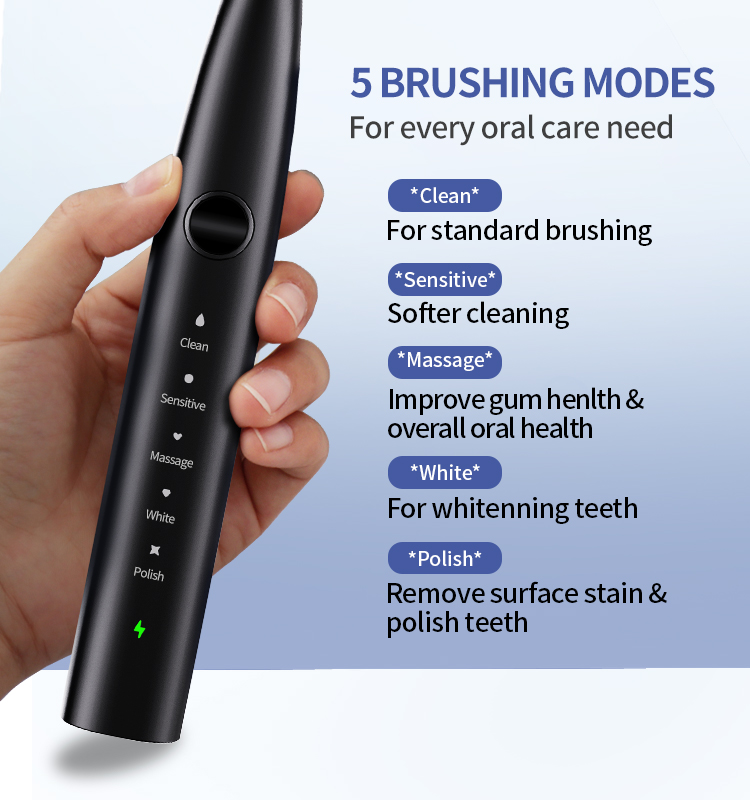 - โหมดการแปรงฟันประสิทธิภาพสูง 5 โหมด ได้แก่ โหมดสะอาด (อ่อนโยน) โหมดขาว (เข้มข้น) โหมดขัดเงา (ความถี่การกลับด้านรุนแรง) โหมดอ่อนกว่า (ความถี่การกลับด้านรุนแรง) และโหมดละเอียดอ่อน (นุ่ม) เพื่อให้เหมาะกับสภาพฟันและเหงือกที่แตกต่างกัน ดังนั้น คุณสามารถเลือกโหมดต่างๆ ได้ตามความต้องการและคำแนะนำของทันตแพทย์