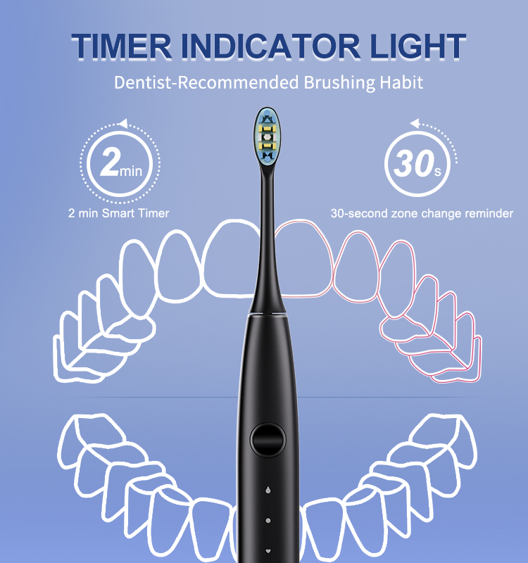 - ตัวตั้งเวลาแจ้งเตือนการสั่นอัจฉริยะ - การควบคุมตัวตั้งเวลาอัจฉริยะในตัว มีช่วงเวลาเตือนให้คุณขยับไปยังส่วนต่อไปของช่องปากทุกๆ 30 วินาที และภายใน 2 นาทีเท่านั้น (4 ส่วน) ซึ่งเป็นคำแนะนำอย่างยิ่งจากทันตแพทย์มืออาชีพ เพื่อเป็นวิธีแปรงฟันที่ถูกต้อง